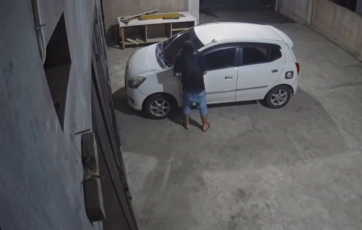 Dalam aksinya, pelaku tampak sempat mengganjal roda belakang kiri mobil untuk mencegah kendaraan bergerak. Setelah itu, ia dengan leluasa mencopot spion dari kedua sisi kendaraan.