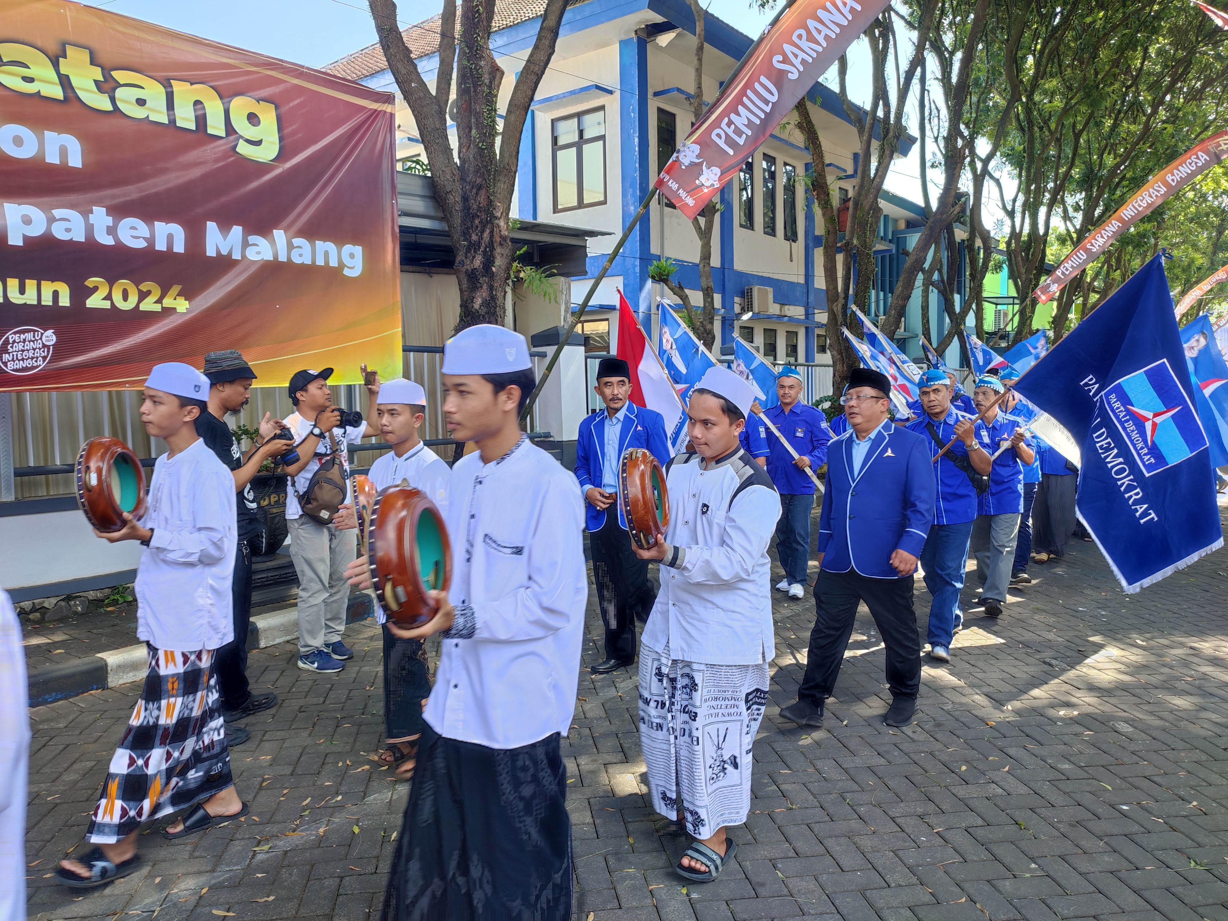 Rombongan pengurus dan kader Demokrat diiringi tabuhan rebana saat tiba di KPU Kabupaten Malang. (bacamalang/Dhimas) Perbesar