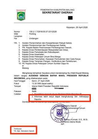 BACAMALANG.COM – DPRD Kabupaten Malang menyoroti dugaan pelanggaran prosedur dalam perjalanan dinas Wakil Bupati Malang ke Jakarta untuk agenda audiensi dengan Wakil Presiden RI. Sorotan ini muncul setelah beredarnya surat Sekretariat Daerah di beberapa grup WA yang dinilai menyisakan sejumlah kejanggalan administratif dan tata kelola pemerintahan.