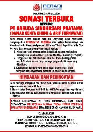 BACAMALANG.COM – Kantor Hukum Didik Lestariyono and Associates resmi melayangkan somasi terbuka terhadap PT Garuda Singhasari Pratama beserta pimpinannya, Damar Genta Bumi dan Arif Furnawan.
